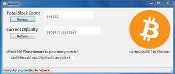 StatCoin allows Bitcoin users to view the current Block Count and Difficulty, as well as check their network connection to the Bitcoin server.
